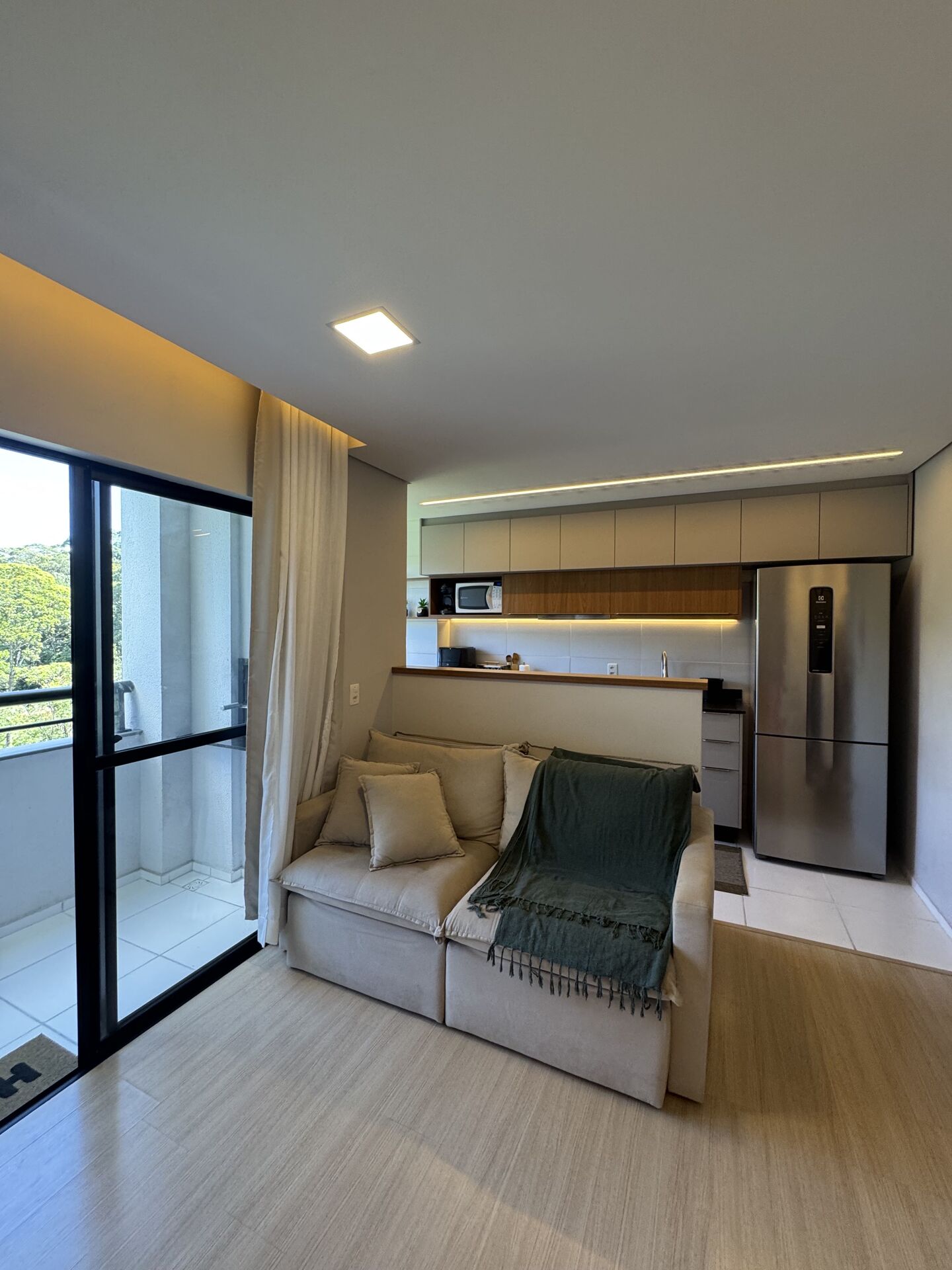 Os ambientes contam com móveis planejados de alta qualidade e garantia de 5 anos, piso porcelanato, rebaixo em gesso e infraestrutura completa para ar-condicionado. A cozinha é completa, com móveis sob medida, cooktop, forno e coifa, tudo pensado para otimizar o espaço e trazer funcionalidade.