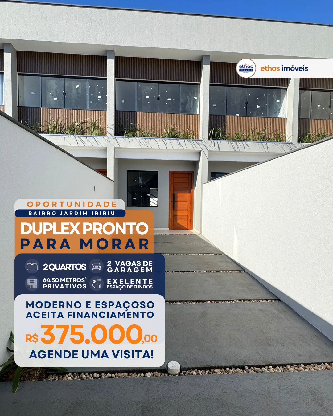 Duplex moderno à venda no Jardim Iririú – 2 quartos, 2 vagas e excelente espaço externo
